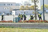 当日は、山邊社長を含む社員25名が揃いのヘルメットと作業服、安全ベストに身を包み、社屋前に参集。作業前のミーティングでは、内野博光取締役技術本部長が前に立ち、「地域の皆さんに感謝の念を持って、歩行中の方々には積極的に挨拶をかわそう。また車の交通量が多いので、互いの意思疎通をしっかりと行って、くれぐれも安全に配慮して清掃活動に勤しもう」と、注意喚起。その後、2班に分かれて作業開始となった。