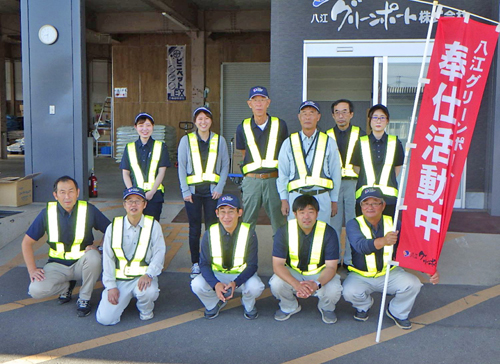 八江グリーンポート㈱(八江一弘社長)が9月28日、道路アダプト活動の一環として道路清掃を行った。当日は午前8時30分~10時30分まで活動、同社社員ら12人が地域貢献活動に励んだ。