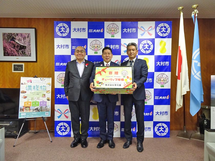 花育活動に力を注ぐ㈱琴花園(大塚正一代表取締役社長)が10日、大村市の園田裕史市長を訪れ、今年も小学1年生に贈るチューリップ球根を手渡した。